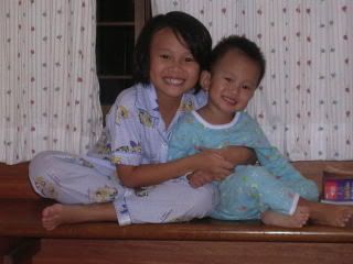 Last but not least, my favourite latest picture of my kids, in pajamas, sitting on a table showing of their wide grin.
